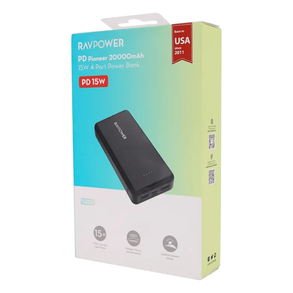 باور بانك RAVPOWER PD Pioneer بسعة 20000 مللي أمبير، وقوة 15 واط، وأربعة منافذ هو شاحن محمول عملي وموثوق، مصمم ليوفر طاقة كافية لشحن أجهزتك المتعددة أثناء التنقل. يركز هذا الموديل على توفير سعة كبيرة ومرونة في الشحن من خلال عدد أكبر من المنافذ، مع الحفاظ على قدرة شحن سريعة كافية للاستخدام اليومي.