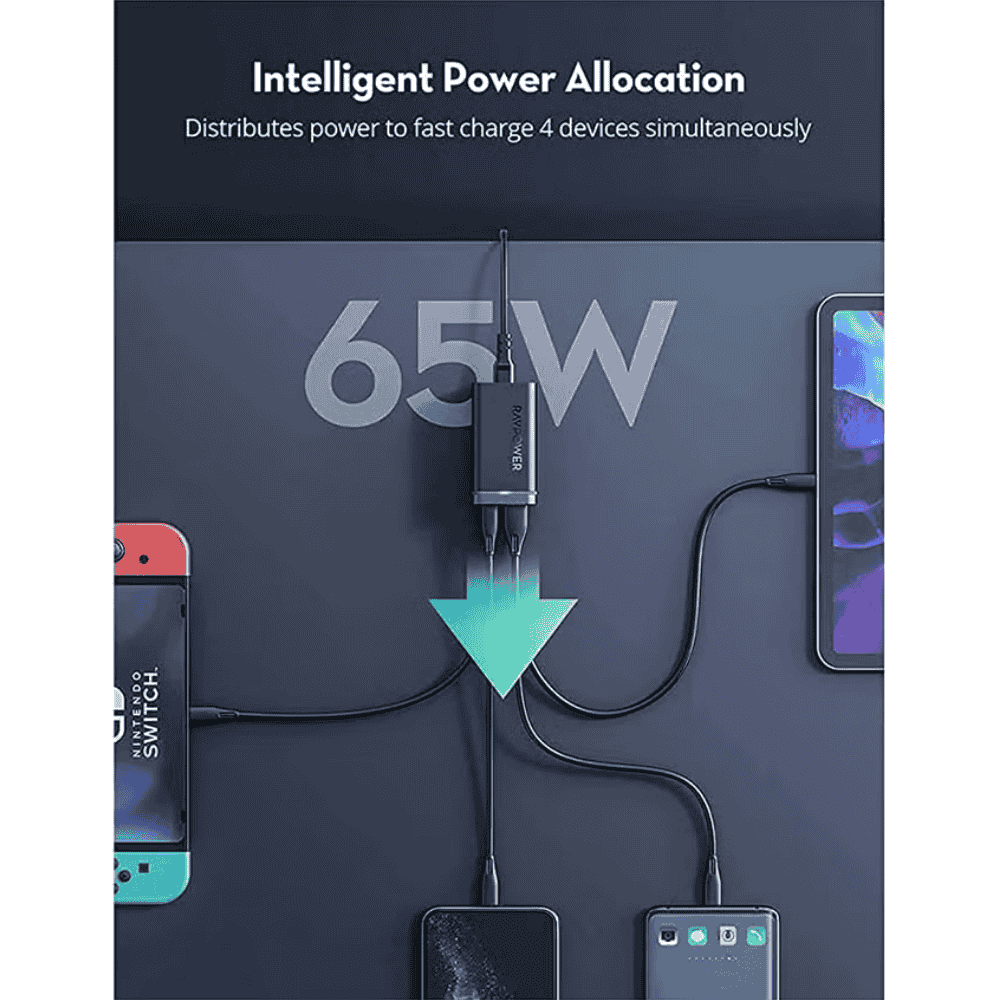 - توزيع الطاقة بين المنافذ يكون ذكيًا ليناسب احتياجات الأجهزة المتصلة.